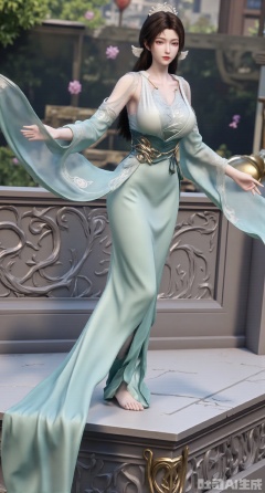 (masterpiece,best quality:1.23),This PVC figurine of a Chinese - style beauty from Chinese comics has red lips and white teeth, with her hair styled in a single - spiral bun and a jadeite hairpin inserted. She is wearing a light - green floor - length dress with the hem embroidered with butterfly patterns. Standing on an ancient - style platform made of marble and with exquisite reliefs, she gently lifts the hem of her dress as if dancing. The background is blurred, presenting a hazy view of a spring garden,(huge breasts, full breasts:2.68),,Xhanfududou,Xsongzhihanfu,Xlujiajia,Xyanqingfei,XfuqingyunY,Xtangqixiongshanqun,Xfeitianhanfu,Xqinghannu,XmeijiX2,XmeijiX,XlingyuyxiuX2,XlingyuyxiuX,Xjianglishenwang,Xjianglishenwang2,XPVCshouban,Xyuanyao,Xxuanyi,XsongyuYK