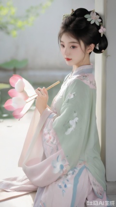 Best quality, Realistic, photorealistic, masterpiece, extremely detailed CG unity 8k wallpaper, best illumination, best shadow, huge filesize ,(huge breasts:2.2), incredibly absurdres, absurdres, looking at viewer, transparent, smog, gauze, vase, petals, room, ancient Chinese style, detailed background, wide shot background, (((1gilr,black hair))),(Sitting on the lotus pond porch:1.39) ,(huge breasts:2.3),(A pond full of pink lotus flowers:1.3),close up of 1girl,Hairpins,hair ornament,hair wings,slim,narrow waist,(huge breasts:2.39),perfect eyes,beautiful perfect face,pleasant smile,perfect female figure,detailed skin,charming,alluring,seductive,erotic,enchanting,delicate pattern,detail,delicate intricate fabrics, Morning Serenade In the gentle morning glow, (a woman in a pink lotus-patterned Hanfu stands in an indoor courtyard:1.26),admiring the tranquil garden scenery. The lotus-patterned Hanfu, embellished with silver-thread embroidery, is softly illuminated by the morning light, with a blurred background to enhance the peaceful atmosphere,(huge breasts:2.59),,Xmingzhihanfu,Xtangqixiongshanqun,Xqinghannu,Xsongzhihanfu