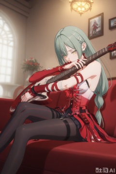 clothes: Phrolovadef red dress, black pantyhose, hair,bandages,asymmetrical detached sleeves,Wakaba Mutsumi,1girl,solo,long hair,green hair,bangs,yellow eyes,hair ornament,hairclip,wakaba mutsumi,sorrow,scenery,sitting,indoors,sitting on sofa,embracing a guitar with both hands,