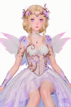 1girl, solo, looking at viewer, blonde hair, simple background, hair ornament, white background, dress, purple eyes, upper body, flower, wings, pointy ears, hair flower, white dress, purple flower, fairy wings, fairy, butterfly wings,sitting,legs,feet,