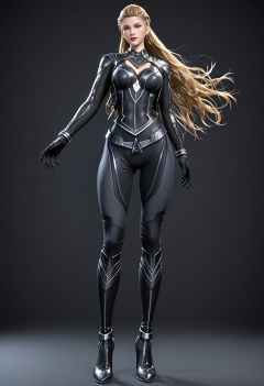 (full_body:1.1),(looking_at_viewer:1.2),(gigantic breasts:0.6),(slender:1.2),facing viewer,<lora:YQ_pony_raoyao_richangfuzhuang_V4:0.8>,q1528437228,1girl,solo,long hair,armor,brown hair,bodysuit,brown eyes,gloves,blonde hair,braid,mole under eye,black bodysuit,boots,grey hair,black hair,jewelry,black gloves,blue eyes,bracelet,belt,green eyes,high heels,(simple background,pure black background,black background:1.1),perfect_anatomy,
