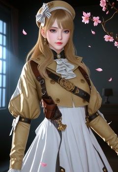 upper_body,(gigantic breasts:0.6),(slender:1.3),(looking_at_viewer:1.1),(masterpiece:1.1),(best quality:1.2),(intricate details),(smog:1.3),(Dark room:1.3),(dim lighting:1.3),peach blossom,falling petals,<lora:YQ_Illustrious光辉v5_云悠悠_潜伏者_V1:0.8>,q1528437228,1girl,solo,hat,long hair,blonde hair,brown hair,beret,black boots,long sleeves,skirt,blue eyes,gloves,dress,thigh strap,jewelry,earrings,ascot,puffy sleeves,white skirt,holster,bow,jacket,black gloves,white bow,cropped jacket,masterpiece,(best quality),(intricate details:0.9) BREAK (intricate details:0.9),(realistic skin:1.2),masterpiece,best quality,newest,absurdres,hiahres,