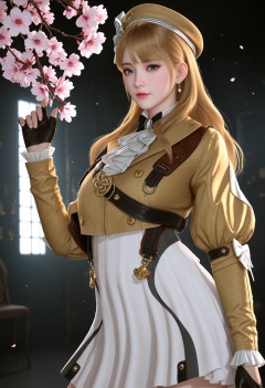 upper_body,(gigantic breasts:0.6),(slender:1.3),(looking_at_viewer:1.1),(masterpiece:1.1),(best quality:1.2),(intricate details),(smog:1.3),(Dark room:1.3),(dim lighting:1.3),peach blossom,falling petals,<lora:YQ_Illustrious光辉v5_云悠悠_潜伏者_V1:0.8>,q1528437228,1girl,solo,hat,long hair,blonde hair,brown hair,beret,black boots,long sleeves,skirt,blue eyes,gloves,dress,thigh strap,jewelry,earrings,ascot,puffy sleeves,white skirt,holster,bow,jacket,black gloves,white bow,cropped jacket,masterpiece,(best quality),(intricate details:0.9) BREAK (intricate details:0.9),(realistic skin:1.2),masterpiece,best quality,newest,absurdres,hiahres,