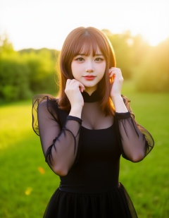 This photograph captures a young Asian woman with fair skin and straight, shoulder-length brown hair. She is standing outdoors in a sunlit field, wearing a sheer black top with puffed sleeves and a black dress underneath. Her expression is neutral, and she is adjusting her hair with both hands. The background features lush greenery and a soft, golden glow from the setting sun, creating a serene, natural ambiance.