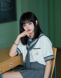 A photograph of a young Asian woman with straight black hair and bangs, sitting at a desk in a classroom. She wears a traditional Japanese schoolgirl uniform: a white blouse with black trim, a grey pleated skirt, and a grey necktie. Her expression is neutral, and she rests her chin on her right hand, which is touching her cheek. The classroom background features green walls and a blackboard on the left. The desk has a Japanese flag sticker. The overall mood is contemplative and slightly melancholic.