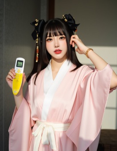 a medium-sized Asian woman,dressed in a kimono-style dress,is adorned with a white belt tied around her waist. Her hair is pulled back in a ponytail,adorned with two black bows,adding a pop of color to her outfit. She is holding a yellow and white remote control in her left hand,while her right hand rests on her right arm. The backdrop,a shadow of a person's shadow can be seen on the right side of the image.,