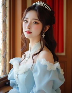 A photograph of a young Asian woman with long, wavy brown hair and a delicate, pale complexion. She wears a light blue, Victorian-style gown with puffed sleeves and a high collar, and a sparkling tiara. She stands by a window with a chain-link design, bathed in soft, natural light, her eyes closed and expression serene. The background features warm, wooden walls and a red curtain, adding to the fairy-tale ambiance. The image exudes elegance and grace.