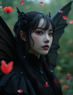 realistic portrait,film style,upper body,Aesthetics of material mourning,illusory and ethereal fairy with black wings,Gothic clothing,the background is the sacred symbol of ideal beauty that is about to disappear,translucent petals drifting with the wind,fluorescent raindrops like broken shadows,a little cold tone,natural hiding color method,complementary color coloring,hazy soft color,warm and glossy,frame composition,like dream,mystery,aestheticism,