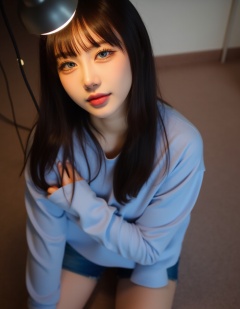 a young Asian woman with long dark hair,wearing a light blue long-sleeved t-shirt and blue shorts,is seated on a brown carpeted floor. Her left hand is draped over her right shoulder,adding a touch of color to the scene. The woman's eyes are a piercing blue,and her lips are a pinkish-pink. Her hair is cascading down her shoulders,framing her face. A light bulb is emitting from the top of her head,casting a shadow on the left side of the image.,