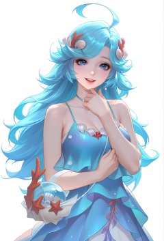 Kuze\(dly\)\(wzry\),white background,simple background,masterpiece,best quality,amazing quality,(realistic:1.2),1girl,solo,mature female,upper body,(front view),look at viewer,human,blue hair,shell on head,coral on head,blue eyes,blue facial mark,necklace,blue dress,pearl on dress,starfish on dress,seaweed on dress,shell on dress,crossbody bag,white elbow decoration,
