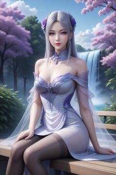 <lora:xiaoyixian_v3:0.4>,xiaoyixian,1girl,solo,hair ornament,hair flower,closed mouth,nose,lips,lipstick,purple eyes,masterpiece,highres,absurdres,best quality,8K,high-res detailed,dress,white dress,purple dress,detached collar,bare shoulders,jewelry,pantyhose,black pantyhose,looking at viewer,sitting,(outdoors,day,waterfall,sky,cloud,park,park bench,lamppost,),(cowboy shot:1.2),shiny legwear,shadow,outdoors,wall,sky,blue sky,cloud,<lora:Cleavage Slider_alpha1.0_rank4_noxattn_last:-1>,