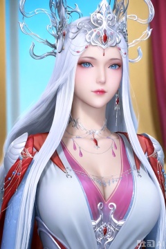 BoSaiXi,1girl, solo, long hair, looking at viewer, blue eyes,BoSaiXi dress, jewelry, upper body, white hair, earrings, indoors, necklace, tiara,crown,big breasts,cleavage