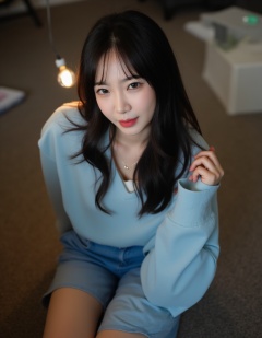 a young Asian woman with long dark hair,wearing a light blue long-sleeved t-shirt and blue shorts,is seated on a brown carpeted floor. Her left hand is draped over her right shoulder,adding a touch of color to the scene. The woman's eyes are a piercing blue,and her lips are a pinkish-pink. Her hair is cascading down her shoulders,framing her face. A light bulb is emitting from the top of her head,casting a shadow on the left side of the image.,