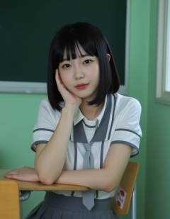 A photograph of a young Asian woman with straight black hair and bangs, sitting at a desk in a classroom. She wears a traditional Japanese schoolgirl uniform: a white blouse with black trim, a grey pleated skirt, and a grey necktie. Her expression is neutral, and she rests her chin on her right hand, which is touching her cheek. The classroom background features green walls and a blackboard on the left. The desk has a Japanese flag sticker. The overall mood is contemplative and slightly melancholic.