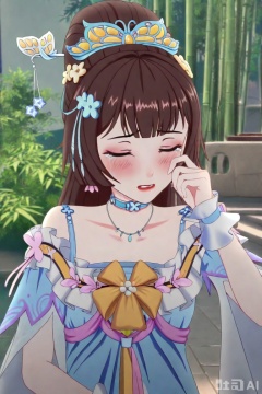 QYX,1girl, solo, long hair, blush, open mouth, bangs, brown hair, hair ornament, dress, jewelry, closed eyes, upper body, outdoors, choker, tears, necklace, crying, tiara, bamboo, wiping tears