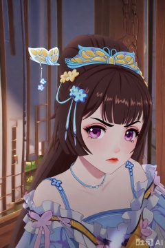 QYX,1girl, solo, long hair, looking at viewer, bangs, brown hair, hair ornament, closed mouth, purple eyes, indoors, lips, angry