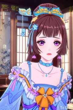 : QYX,1girl, solo, long hair, looking at viewer, bangs, brown hair, hair ornament, closed mouth, purple eyes, indoors, lips,,QYX