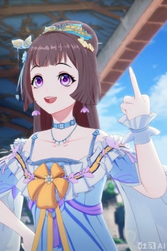 1girl, solo, long hair, smile, open mouth, bangs, brown hair, hair ornament, dress, jewelry, purple eyes, collarbone, earrings, outdoors, sky, choker, day, necklace, blue sky, blue dress, tiara, pointing,QYX