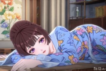 1girl, solo, looking at viewer, short hair, bangs, brown hair, purple eyes, lying, indoors, makeup, on side, floral print, blanket, quilt,pajamas, distribute,Side lying,QYX