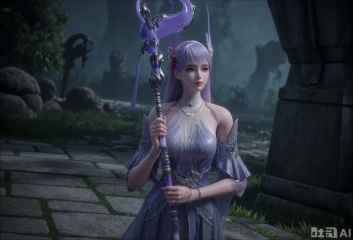 A beautiful, ethereal woman stands on a misty, ancient stone pathway. She has pale skin and long, lavender hair adorned with delicate feathers and a small flower. Her dress is a flowing, sheer lavender gown with intricate lace detailing, revealing her shoulders and part of her chest. She holds a staff with a purple orb at the top. The background is a mystical, overgrown forest with large, moss-covered stones. The lighting is soft and diffused, creating a dreamy, otherworldly atmosphere. The style is fantasy art with a focus on elegance and mystique.