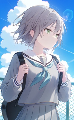 masterpiece,very aware,(highres),absurdres,newest,best quality,high quality,chromatic_aberration,White Theme,lightblue Theme,//,1girl, instrument case, guitar case, chain-link fence, solo, school uniform, fence, green eyes, serafuku, short hair, sky, grey hair, skirt, outdoors, miyamasuzaka girls' academy school uniform, long sleeves, neckerchief, sailor collar, white sailor collar, pleated skirt, cloud, shirt, closed mouth, upper body, day, blue sky, grey shirt, blue neckerchief, grey serafuku, grey skirt, hair between eyes, contrail, looking afar, hair ornament, looking to the side, holding strap, expressionless//,absurdres,newest,very aesthetic,amazing quality,highres,sensitive,ultra detailed,best anatomy,HDR,8K,high detail RAW color art,high contrast,illustration,depth of field,(colorful),phenomenal aesthetic,detailed light,blurred picture,Tyndall effect,contrast,lens flare,cinematic lighting,//,<lora:timmoo——【noob】hans:1>,