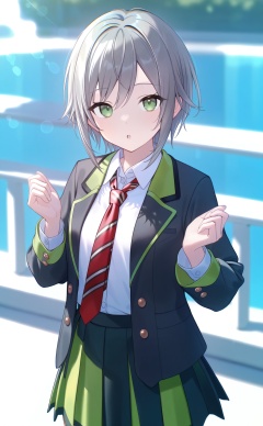 masterpiece,very aware,(highres),absurdres,newest,best quality,high quality,chromatic_aberration,White Theme,lightblue Theme,//,1girl, jacket, solo, shirt, skirt, white shirt, pleated skirt, green eyes, necktie, diagonal-striped necktie, collared shirt, diagonal-striped clothes, grey hair, open jacket, black jacket, open clothes, school uniform, red necktie, looking at viewer, blazer, :o, black skirt, long sleeves, striped clothes, dress shirt, hands up, blurry background, standing, striped necktie, short hair, parted lips, blurry, hair between eyes, railing, outdoors, green skirt//,absurdres,newest,very aesthetic,amazing quality,highres,sensitive,ultra detailed,best anatomy,HDR,8K,high detail RAW color art,high contrast,illustration,depth of field,(colorful),phenomenal aesthetic,detailed light,blurred picture,Tyndall effect,contrast,lens flare,cinematic lighting,//,<lora:timmoo——【noob】hans:1>,
