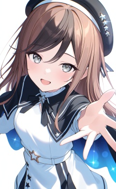 masterpiece,very aware,(highres),absurdres,newest,best quality,high quality,chromatic_aberration,White Theme,lightblue Theme,//,1girl, solo, hat, long hair, beret, dress, looking at viewer, reaching towards viewer, reaching, black hair, simple background, white dress, smile, neck ribbon, black headwear, open mouth, star \(symbol\), brown hair, grey eyes, dutch angle, star print, cape, black cape, ribbon, official alternate costume, blush, black ribbon, hair between eyes, two-tone dress, swept bangs//,absurdres,newest,very aesthetic,amazing quality,highres,sensitive,ultra detailed,best anatomy,HDR,8K,high detail RAW color art,high contrast,illustration,depth of field,(colorful),phenomenal aesthetic,detailed light,blurred picture,Tyndall effect,contrast,lens flare,cinematic lighting,//,<lora:timmoo——【noob】hans:1>,