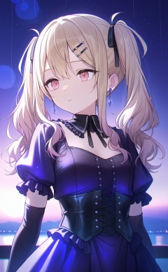 masterpiece,very aware,(highres),absurdres,newest,best quality,high quality,chromatic_aberration,White Theme,lightblue Theme,//,solo, jewelry, 1girl, gloves, star \(sky\), corset, hair ornament, earrings, dress, sky, short sleeves, twintails, hairclip, elbow gloves, starry sky, official alternate costume, black gloves, cross-laced clothes, night, long hair, puffy short sleeves, night sky, closed mouth, black corset, pink eyes, puffy sleeves, black dress, official alternate hairstyle, upper body, cross-laced dress, looking to the side, purple theme, akiyama mizuki, expressionless, frilled sleeves, purple sky, sidelocks, gradient sky, neck ribbon, detached collar, looking afar, frills, ribbon, blonde hair, outdoors, dot nose, wavy hair, purple dress, hair between eyes, rain, black ribbon//,absurdres,newest,very aesthetic,amazing quality,highres,sensitive,ultra detailed,best anatomy,HDR,8K,high detail RAW color art,high contrast,illustration,depth of field,(colorful),phenomenal aesthetic,detailed light,blurred picture,Tyndall effect,contrast,lens flare,cinematic lighting,//,<lora:timmoo——【noob】hans:1>,