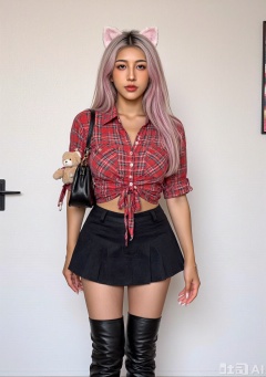 A photograph of a young dark skin woman with long pink-blue hair,shoulder-length pink-blue hair,red plaid crop top,black layered skirt,heart-shaped belt,black lace-up boots,cat ears,black bag,fluffy tail,teddy bear attached,