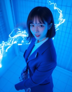 Masterpiece,Top quality,beautiful Korean woman,doll-like face,clean skin,neat deep cobalt blue short cut,bright determined grin,school blazer power suit,blazer seams glowing with blue light,plaid skirt with energy field shimmer,active pose,whipping a glowing energy chain upwards,dynamic arc of blue light in front of her face,intensely saturated monochromatic cobalt blue background,digital grid pattern,POV,high angle,face-focused close-up,looking up at viewer,