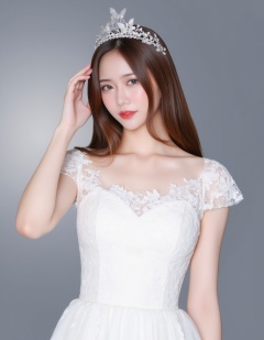 This is a photograph of a young Asian woman with fair skin and long, straight brown hair. She is wearing a white lace dress with intricate floral patterns. Her makeup is bold, featuring red lipstick and dark eye makeup. A delicate, silver headpiece with floral and butterfly motifs adorns her head. She stands against a gradient gray background, with one arm raised, touching her hair. The overall aesthetic is ethereal and elegant, emphasizing her soft features and the texture of the lace fabric.