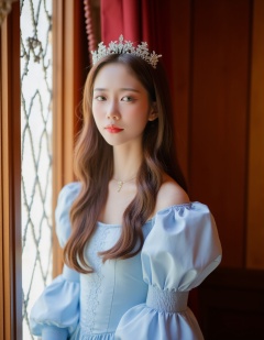 A photograph of a young Asian woman with long, wavy brown hair and a delicate, pale complexion. She wears a light blue, Victorian-style gown with puffed sleeves and a high collar, and a sparkling tiara. She stands by a window with a chain-link design, bathed in soft, natural light, her eyes closed and expression serene. The background features warm, wooden walls and a red curtain, adding to the fairy-tale ambiance. The image exudes elegance and grace.