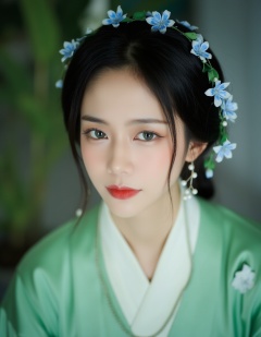 Captured at eye-level,a close-up shot of a young Asian woman,dressed in a green kimono,adorned with a white necklace and earrings. Her hair is styled in a low bun,and she's wearing a headband adorned with blue flowers. The background is blurred,creating a stark contrast to the woman's outfit. The woman's hair is dark,adding a touch of greenery to the scene.,