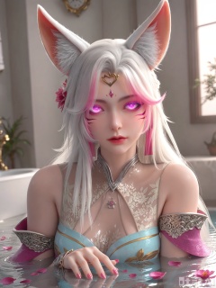 score_9,score_8_up,score_7_up,1girl,looking_at_viewer,realistic,1girl,Vivid Colors,bright environment,delicate water,hair_ornament,shiny skin,shiny hair,reflection,(wariza:1.2),dress,jewelry,flower sea,falling petals,extreme detail description,(upper body:0.4),put one hand on your side,long_hair,(skindentation:1.3),Fishnet stockings,bright,sunshine on face,facial_mark,fox ears,glowing eyes,Indoor bath,Indoor bath,bathroom,shiny,Metallic texture,Metallic texture,Magical light effects,