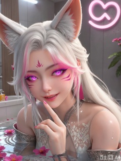 score_9,score_8_up,score_7_up,1girl,looking_at_viewer,realistic,1girl,Vivid Colors,bright environment,delicate water,shiny skin,shiny hair,reflection,(wariza:1.2),dress,jewelry,flower sea,falling petals,extreme detail description,(upper body:0.4),put one hand on your side,long_hair,(skindentation:1.3),Fishnet stockings,bright,sunshine on face,facial_mark,fox ears,Indoor bath,Indoor bath,bathroom,shiny,Metallic texture,Metallic texture,Magical light effects,bright_pupils,bright background,neon sign reflections on wet asphalt,Radiant,close-up of hands making a delicate finger heart gesture,hand heart gesture,kawaii chibi smile with tiny fangs, sparkling eyes,