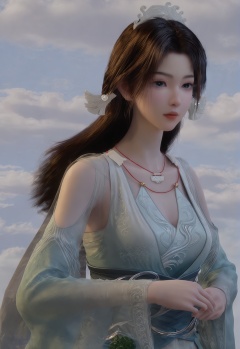 score_9,1girl, solo, long hair, jewelry, white background, dress, necklace, brown hair, upper body, simple background, blue dress, hair ornament, sash, detached sleeves,<lora:宋玉:1>,blue sky, sky