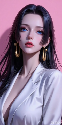 1girl, solo, realistic, long hair, black hair, lips, looking at viewer, simple background, parted lips, upper body, jewelry, earrings, suit,white suit, pink_background,simple background,shadow
