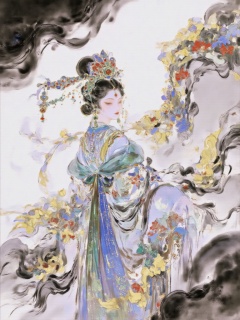 bai,This is a beautiful hand-painted ink-wash ink-wash illustration in ancient Chinese style. The picture depicts a cold and elegant beauty with her back to the side and head turned, looking back (her body slightly leans, her long black hair curls in the wind, and the hair strands are lively and curly like waves). Her green eyes have a faint light, her lips are rich and bright, and her skin has a cold and bluish luster. The forehead is adorned with a red and green pendant chain (linked by gold chains, with a lustrous pendant), and the earrings are designed with multiple tassels (inlaid with green pine and colored beads, flowing gracefully). The wearer is dressed in a traditional robe embroidered with indigo and dark green patterns (with a stand-up collar and fine patterns like meticulous brushwork). The background is surrounded by black twisted vines (interwoven with hair strands, with flowing brushstrokes of ink wash), dotted with yellow half-blooming peonies and red berries, and the light blue background is blurred with ink wash. The style blends the fluidity of ink wash (the dynamics of hair and branches) with the contrast of rich colors (indigo robe × yellow and red accents), creating an atmosphere of eerie elegance, mystery and cold beauty.