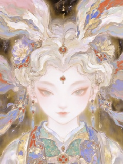 bai,Rock paintings,A striking portrait of a young girl with the head of a rabbit,her fur a soft cream-white,blending seamlessly into her human neck. Her rabbit face is adorned with intricate Chinese traditional motifs--delicate yunwen (cloud patterns) swirling across her cheeks,a lianhua (lotus flower) on her forehead,and ruyiwen (ruyi symbols) tracing her jawline in gold and crimson ink. Her long ears cascade down her back,one tipped with a tiny Chinese bell. She wears a Ming Dynasty-inspired embroidered collar,its threads shimmering against the muted background of an ink-wash shanshuihua (mountain-water painting). The style merges contemporary digital art with classical Chinese brushwork,hyper-detailed yet ethereal,her dark almond-shaped eyes holding quiet mystery.,