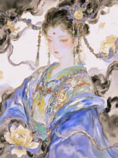 bai,Rock paintings,bai,This is a beautiful hand-painted ink-wash ink-wash illustration in ancient Chinese style. The picture depicts a cold and elegant beauty with her back to the side and head turned, looking back (her body slightly leans, her long black hair curls in the wind, and the hair strands are lively and curly like waves). Her green eyes have a faint light, her lips are rich and bright, and her skin has a cold and bluish luster. The forehead is adorned with a red and green pendant chain (linked by gold chains, with a lustrous pendant), and the earrings are designed with multiple tassels (inlaid with green pine and colored beads, flowing gracefully). The wearer is dressed in a traditional robe embroidered with indigo and dark green patterns (with a stand-up collar and fine patterns like meticulous brushwork). The background is surrounded by black twisted vines (interwoven with hair strands, with flowing brushstrokes of ink wash), dotted with yellow half-blooming peonies and red berries, and the light blue background is blurred with ink wash. The style blends the fluidity of ink wash (the dynamics of hair and branches) with the contrast of rich colors (indigo robe × yellow and red accents), creating an atmosphere of eerie elegance, mystery and cold beauty.