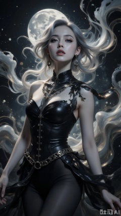 Under the cold moonlight, long hair with silver - gray highlights cascades like a waterfall. Her angular face is sculpted into a stern silhouette by the light and shadow. Ice - blue eyes under smoky makeup seem to hold stars within. She wears a black leather corset dress, and metallic chain decorations glimmer in the light. Flowing light and shadow twine around her slender fingers, casting a fragmented and sharp shadow behind her—mysterious and stunningly cold.