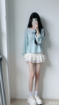 A young and beautiful woman takes a mirror selfie, with a phone hiding her face. She has long black hair, wearing a light blue loose - knit sheer sweater with tie details, paired with a white lace - ruffled mini skirt, white socks, and white platform sneakers. The background is a solid - color one. It’s an indoor scene filled with natural light, featuring light and shadow.