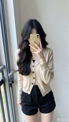 A woman with long wavy black hair takes a mirror selfie, holding a golden phone to cover her face. She wears a beige, long - sleeved, buttoned - up cardigan and black shorts. The setting is indoors, next to a window with natural light, against a light - colored wall