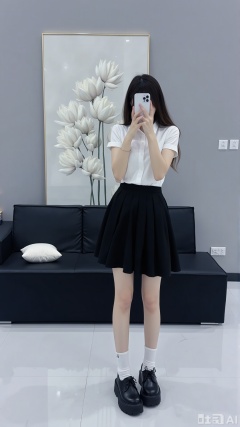 A woman takes a mirror selfie, with a phone covering her face. She is dressed in a white short - sleeved shirt, a black pleated skirt, white socks, and black platform shoes. Behind her, there is a black sofa with a white pillow, and a framed painting of white flowers hangs on the gray wall.