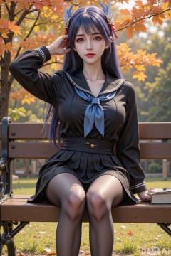 Masterpiece, best quality, high quality, (colorful), small chest, (blue hair: 1.4), (long legs: 1.3),1girl,solo,skirt,black hair,school uniform,shirt,lying,serafuku,black shirt,on back,blush,long sleeves,long hair,sailor collar,black skirt,black serafuku,pleated skirt,black sailor collar,bangs,looking at viewer,bow,autumn leaves,arm up,hair between eyes,leaf,outdoors,brown eyes,puffy long sleeves,bench,ginkgo leaf,closed mouth,day,on bench,parted lips,autumn,holding book,