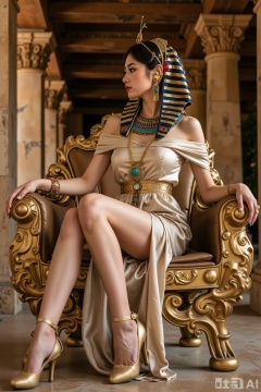 Realistic photo of a young woman, Egyptian pharaoh headdress, off-shoulder silk dress, long legs, golden heels, full body, sitting, golden throne, Egyptian temple,