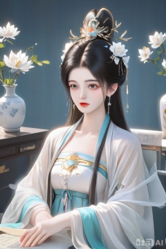 1girl, solo, long hair, blue eyes, black hair, hair ornament, long sleeves, dress, jewelry, sitting, closed mouth, upper body, flower, earrings, indoors, hair flower, white dress, book, facial mark, chinese clothes, white flower, forehead mark, scroll, book stack, vase, hanfu