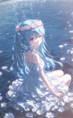 masterpiece,very aware,highres,absurdres,newest,best quality,loli,petite,high quality,chromatic_aberration,cinematic_angle,dutch angle, //,artist:ciloranko,artist:ningen_mame,artist:sho_(sho_lwlw),artist:rhasta,artist:wlop,artist:ke-ta,artist:hiten \(hitenkei\),//,1girl, solo, long hair, looking at viewer, bangs, blue eyes, hair ornament, dress, hair between eyes, bare shoulders, sitting, blue hair, flower, looking back, hair flower, water, white dress, blue flower, head wreath, hatsune miku <lora:lora-000007.by_tusi:0.8>