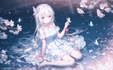 masterpiece,very aware,highres,absurdres,newest,best quality,loli,petite,high quality,chromatic_aberration,cinematic_angle,dutch angle, nyalia, //,artist:ciloranko,artist:ningen_mame,artist:sho_(sho_lwlw),artist:rhasta,artist:wlop,artist:ke-ta,artist:hiten \(hitenkei\),//1girl, butterfly, bug, solo, white butterfly, dress, long hair, white dress, white hair, flower, sitting, cherry blossoms, looking at viewer, branch, barefoot, hair ornament, white flower, wariza, petals, pink eyes, water, very long hair, hand up, bubble, hair between eyes, butterfly hair ornament, breasts, arm ribbon, pink flower, full body, closed mouth, short sleeves, artist name, white bow, bow, ribbon, red eyes, partially submerged, hair flower, medium breasts, white theme, butterfly on hand, bare shoulders, ahoge, pink ribbon, shallow water, frills, falling petals, petals on liquid, tree, parted lips, in water, outdoors, expressionless, orb, night, antenna hair, albino, detached sleeves, watermark, pale skin, bowtie, blush, jewelry, wrist ribbon, frilled dress, sleeveless dress, swept bangs, small breasts, off-shoulder dress, sleeveless, twitter username, purple eyes, collar <lora:lp400-000007p:0.7>