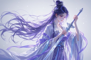 Lighting, Dramatic Lighting, Ray Tracing, (artist:quasarcake:0.8), extreme aesthetic, (wlop:0.6), White background, very long hair, simple background, white theme, folds, close your mouth, 1 girl, solo, long hair, weapon, purple hair, sword, Chinese clothing, Hanfu, holding, holding a weapon, long sleeves, purple eyes, whole body, holding a sword, purple dress, wide sleeves, bun, shut up, floating hair, jewelry, half body, animated clothes, ancient Hanfu, light particles, chinese clothes, hanfu, ice blue hair, flower, background, long sleeves, <lora:lora:0.3>,